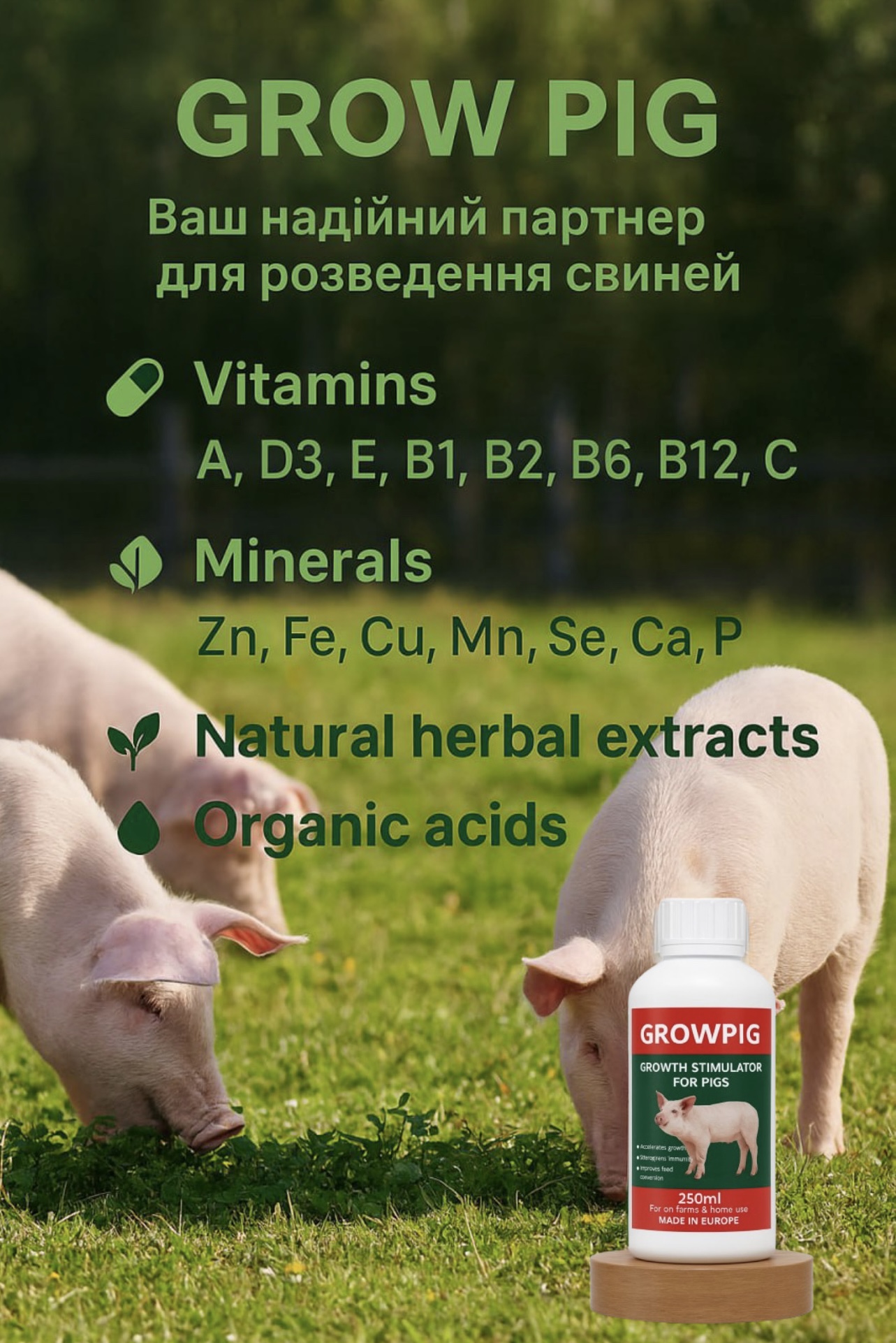GrowPig — це високоефективний стимулятор, створений для прискореного росту та розвитку свиней. Його формула містить комплекс вітамінів, мінералів та амінокислот, що покращують обмін речовин, підвищують апетит і сприяють швидкому набору м’язової маси.