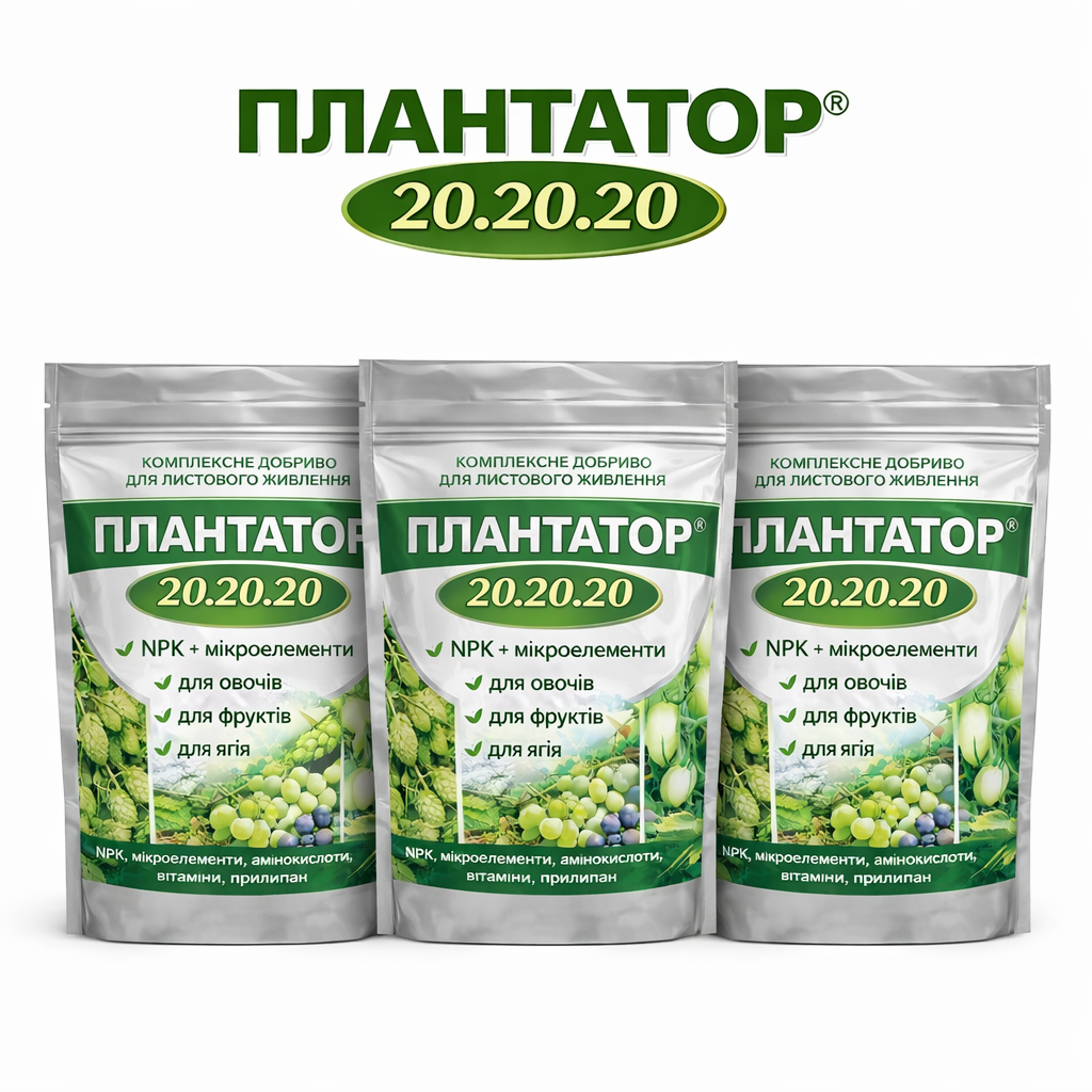 1️⃣ ПЛАНТАТОР 20.20.20 — комплексне мінеральне добриво для активного росту рослин. Забезпечує рослини поживними речовинами та сприяє швидкому розвитку.