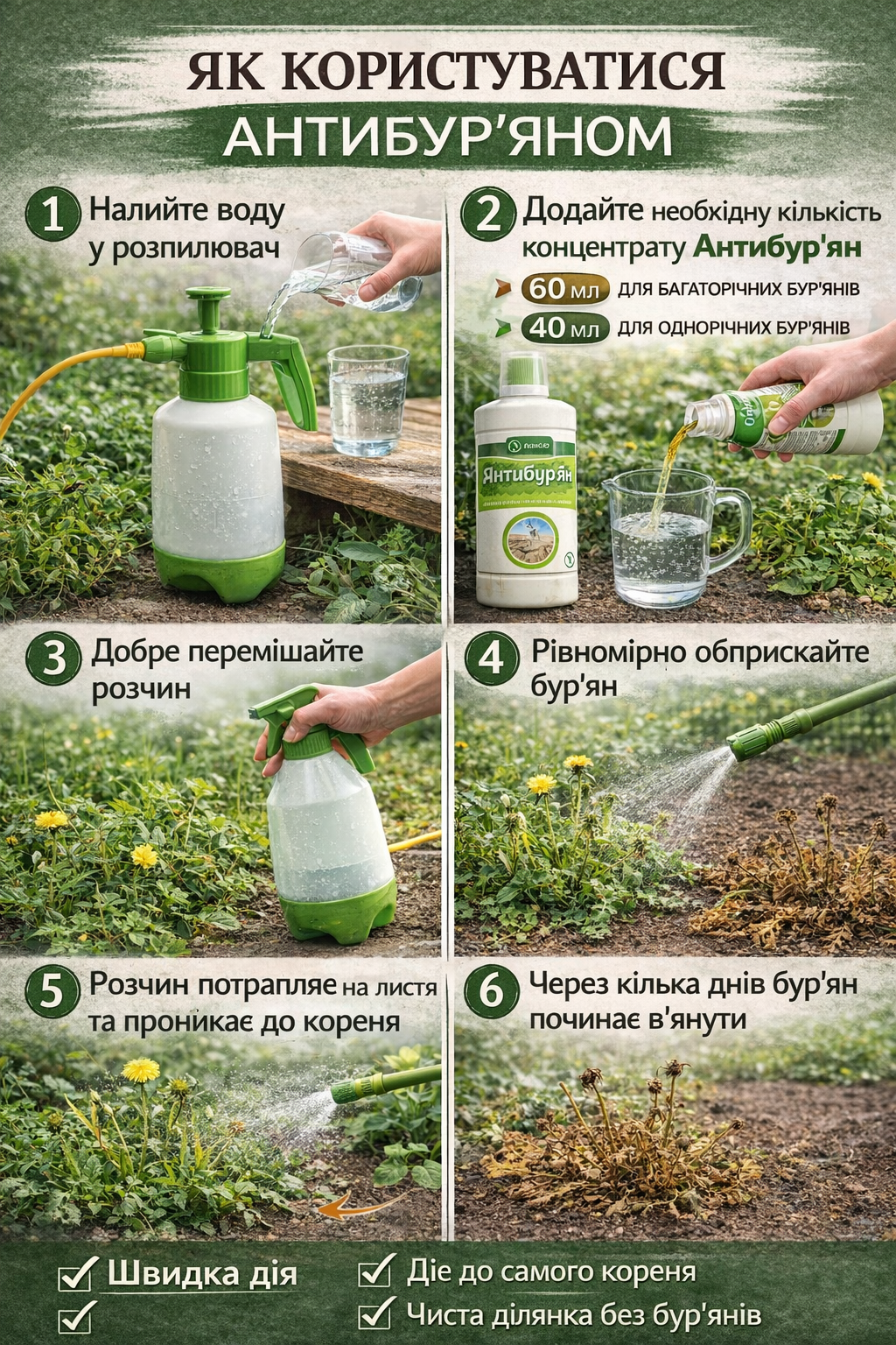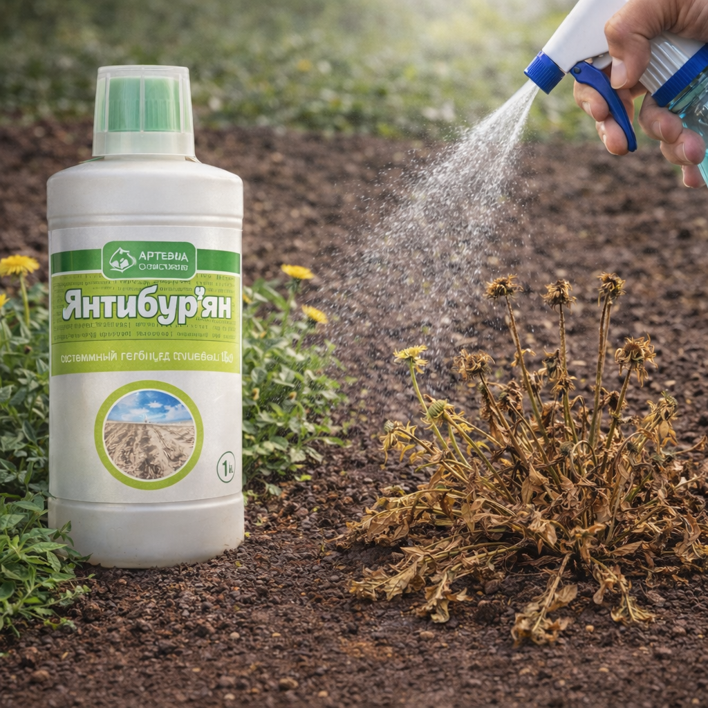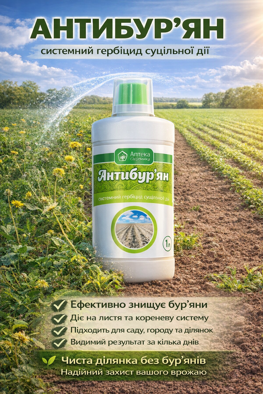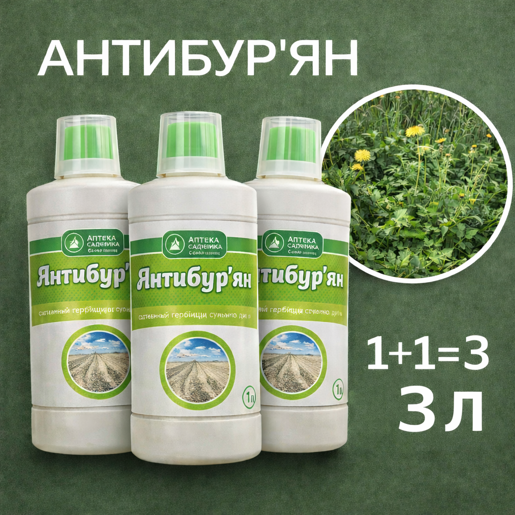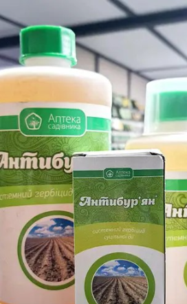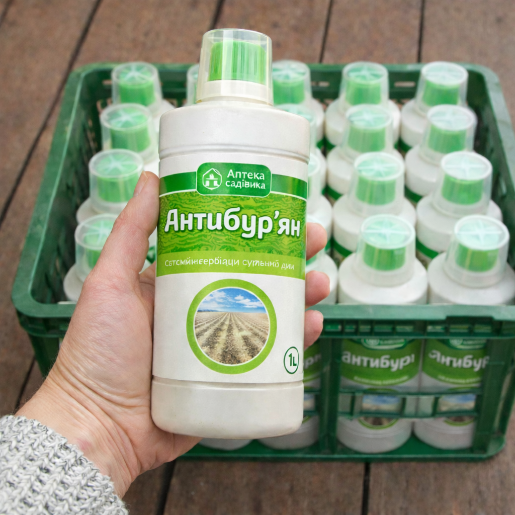 1️⃣ Антибур’ян — ефективний системний гербіцид для швидкого знищення бур’янів на ділянці. Діє через листя та проникає до кореневої системи.