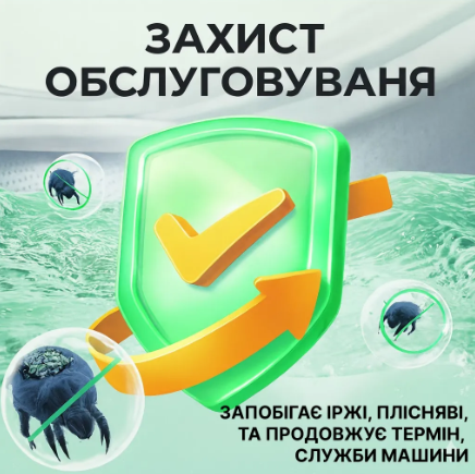 Подовжує термін служби вашої пральної машини, запобігаючи іржі, цвілі та пошкодженню гумових ущільнювачів. Формула на рослинній основі з технологією четвертинного амонію знищує 99,9% бактерій і пилових кліщів, одночасно захищаючи компоненти вашої пральної машини.