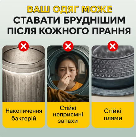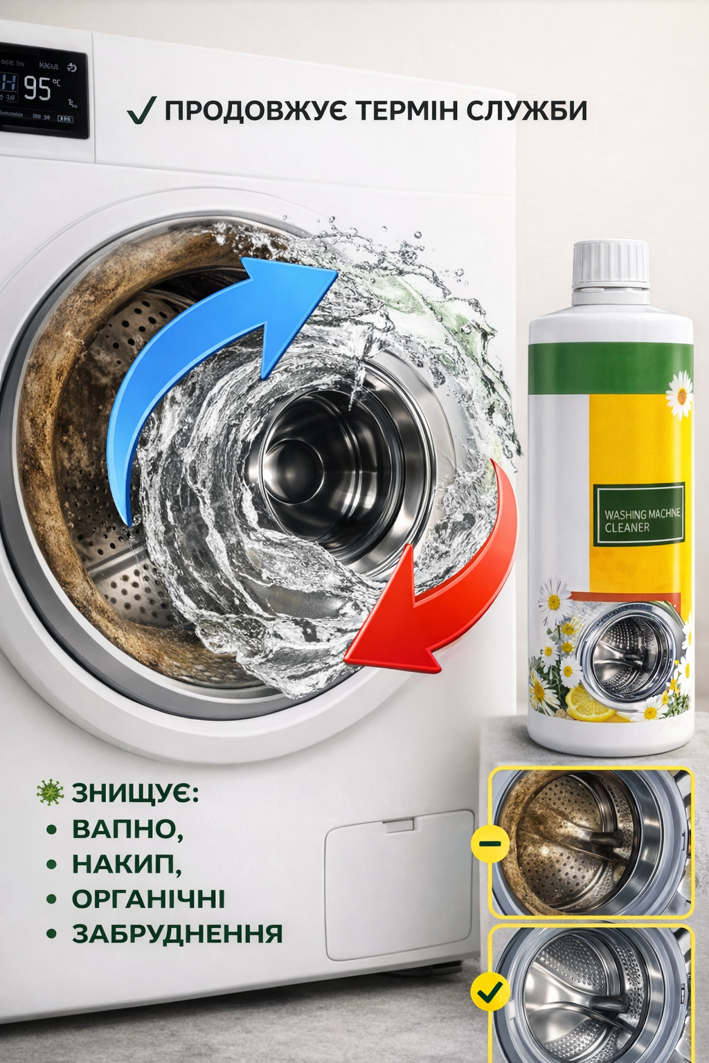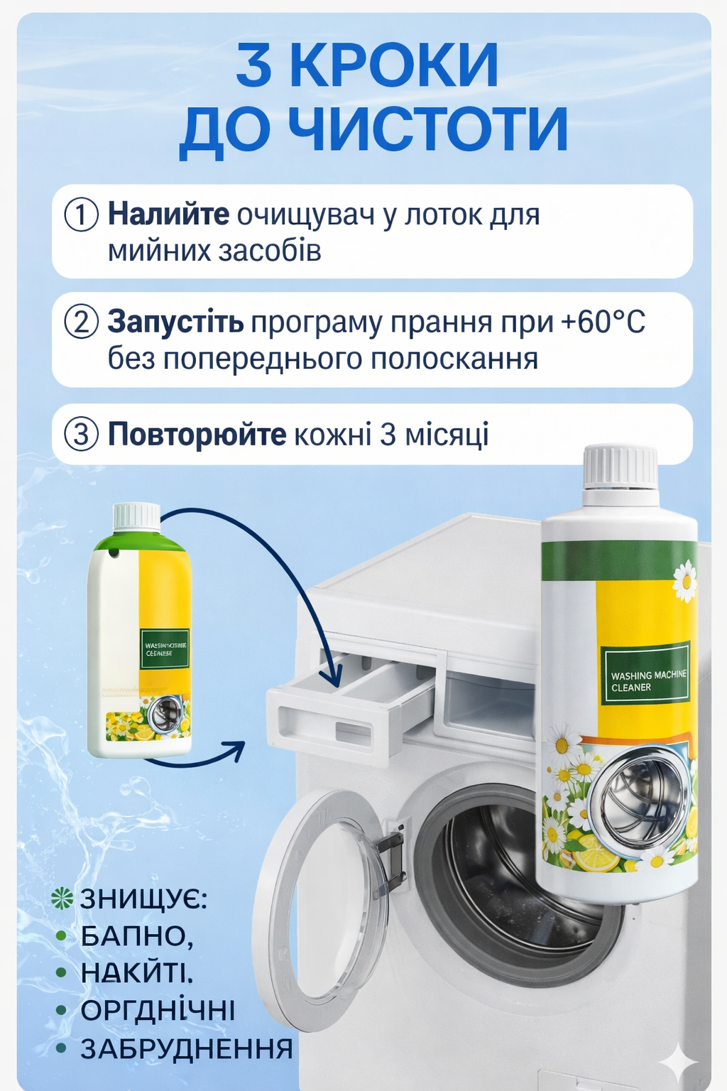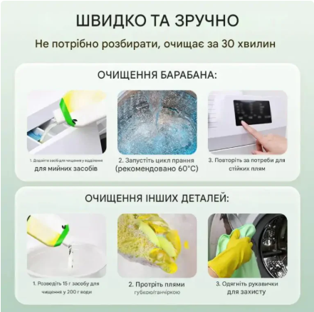 Безпечний для всіх деталей пральної машини, включаючи барабани, кришки, скло дверцят та ущільнювачі. Некорозійні інгредієнти рослинного походження забезпечують ефективне очищення без пошкодження делікатних поверхонь.